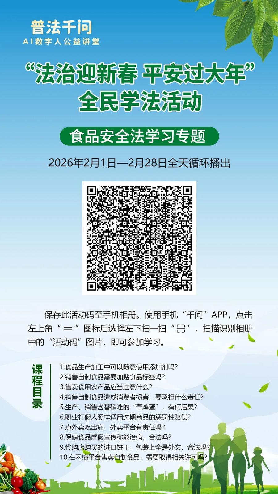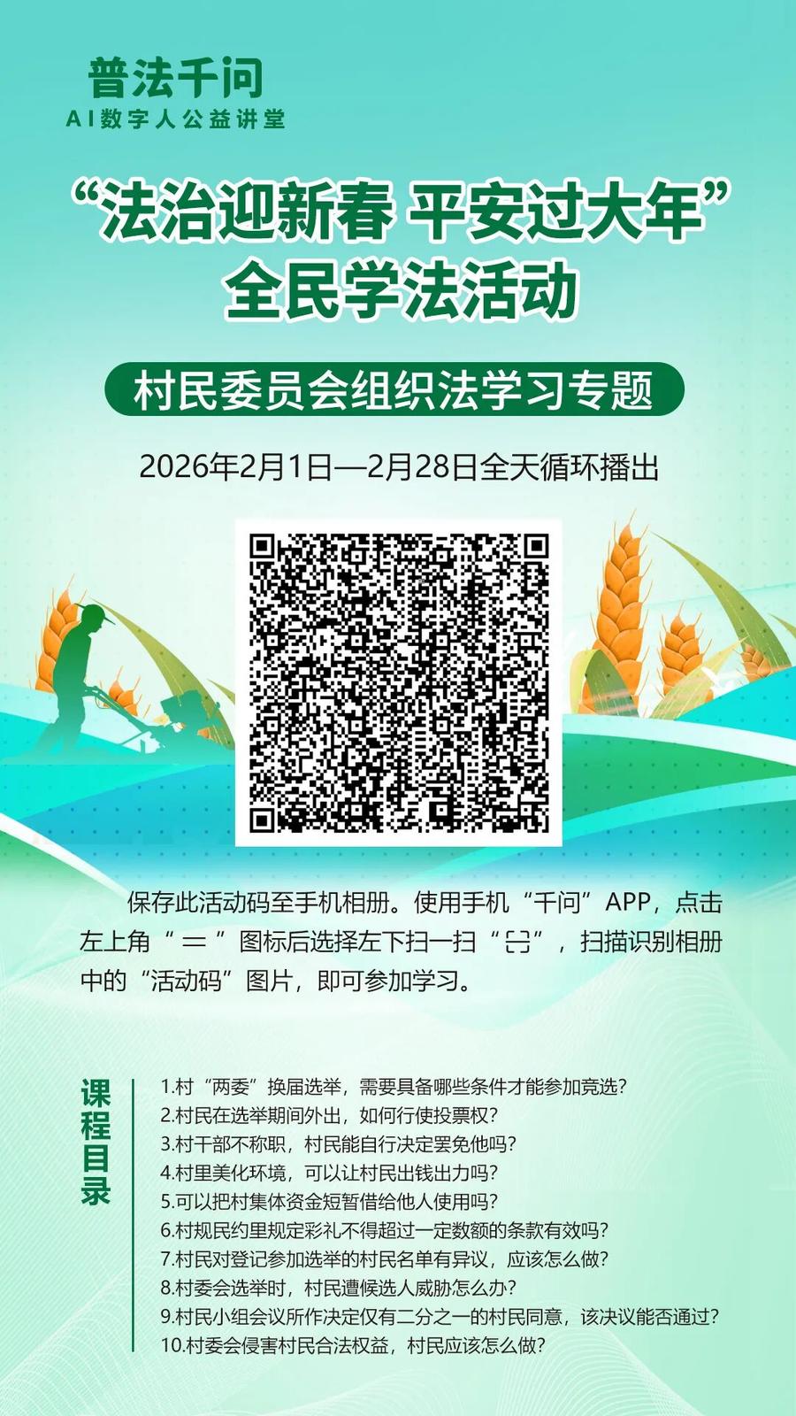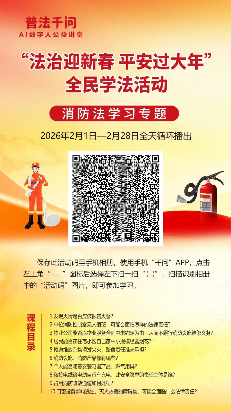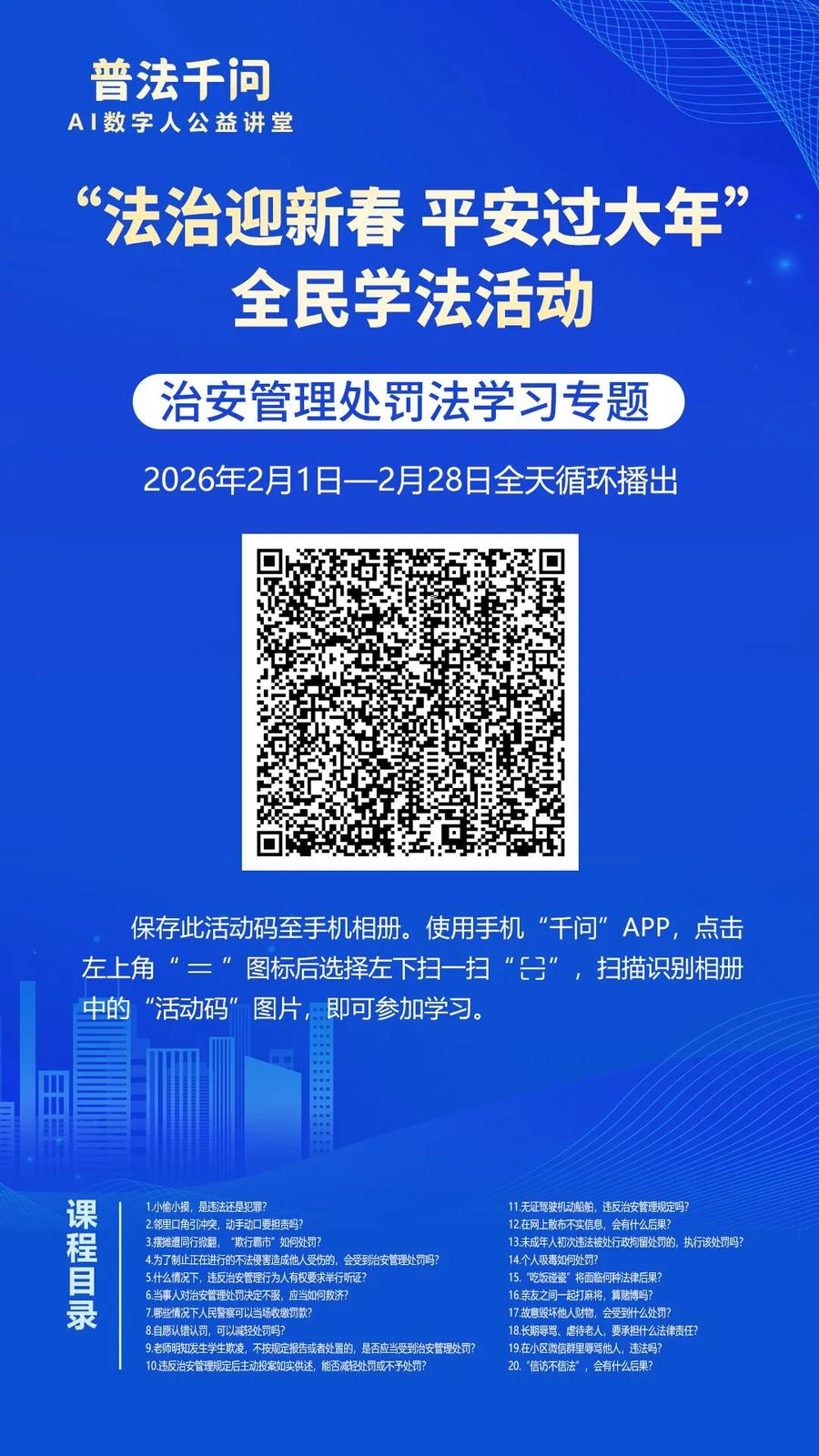 2026年春节将至,为深入贯彻习近平法治思想和《中华人民共和国法治宣传教育法》,努力营造和谐安定的社会环境,确保人民群众度过一个安定祥和的春节,枣庄市普法办公室联合中国民主法制出版社《法治时代》杂志,在2026年春节期间开展“普法千问”AI数字人公益讲堂暨“法治迎新春 平安过大年”全民学法活动。